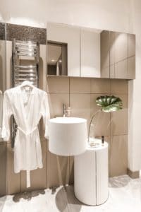 • Swanky bedroom with bespoke joinery, bold wall decorations and ensuite with Italian designer sanitary ware.