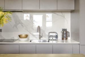 • Choice of large light grey floor tiles and bright yet toned wall colours added to the feeling of a modern and functional space.