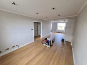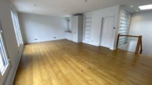Internal strip out of all wall and floor coverings in preparation of making good and redecoration. New electrical and heating installations. Completely new bathroom ( change of layout). New kitchen. Made to measure wardrobes and cupboards. Out with old carpets and in with new elegant hardwood flooring